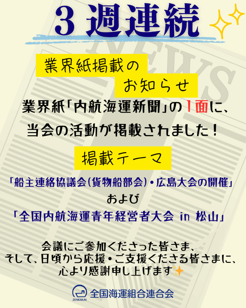 【お知らせ】3週連続で業界紙「内航海運新聞」の1面に、当会の活動が掲載されました! 2025 11/04 お知らせ 全海運からのお知らせ 2025年11月4日 お知らせ 全海運からのお知らせ 【ご報告】2025年10月16日「2025年度 船主連絡協議会(貨物船部会)・広島大会」を開催しました!