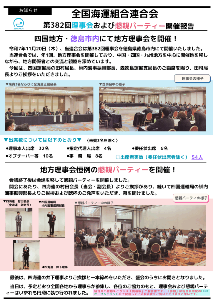 【ご報告】徳島市内にて「第382回理事会および懇親パーティー」を開催しました! 2025 11/26 お知らせ 全海運からのお知らせ 2025年11月26日 お知らせ 全海運からのお知らせ 【お知らせ】3週連続で業界紙「内航海運新聞」の1面に、当会の活動が掲載されました! 【お知らせ】鹿児島内航海運組合より貨物船「第三廣良丸」の見学会について情報提供いただきました!