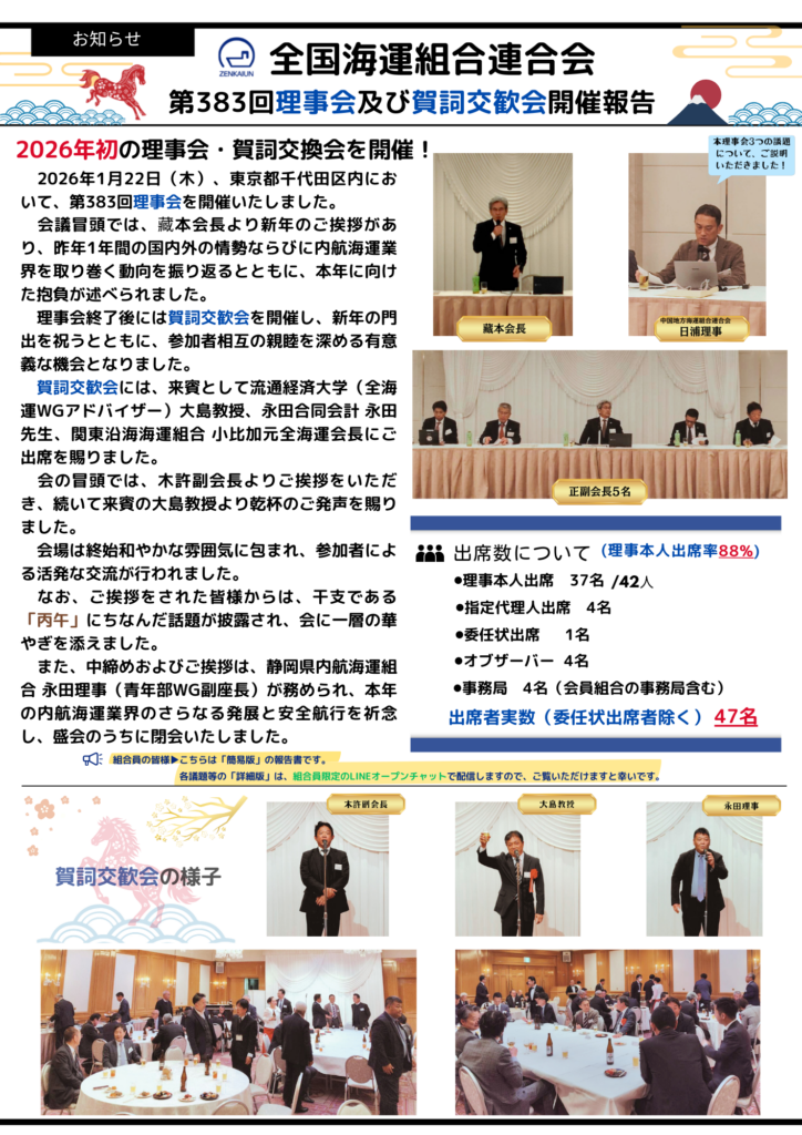 【ご報告】都内にて「第383回理事会および賀詞交歓会」を開催しました! 2026 1/23 お知らせ 全海運からのお知らせ 2026年1月23日 お知らせ 全海運からのお知らせ 船主連絡協議会 令和7年度オペレーター訪問(貨物船部会)概要 【周知】全国健康保険協会より船員保険事業に係る広報のお知らせ